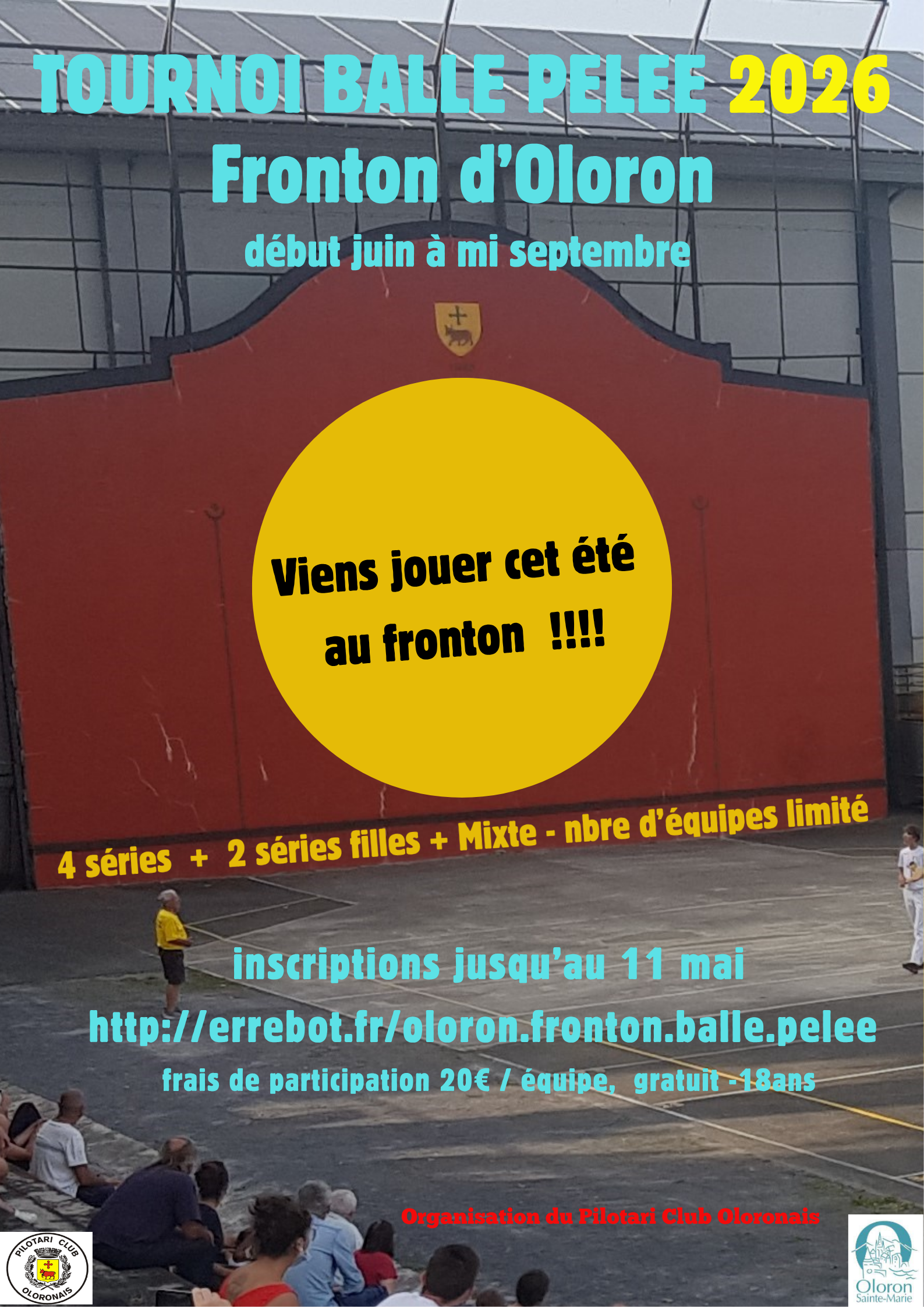 30 mars 2026Joan Cantegrel Tournoi Balle Pelée d’Oloron 2026 S’inscrire au tournoi Le tournoi est ouvert à l’inscription en ligne le 7 avril Place Libre Inscriptions du 7 avril au 11 mai 2026 52 équipes sur 6 séries 20€ par équipes, Gratuit pour les -18 ans Début du tournoi le 1 juin 2026 Finales 19 septembre 2026 Oloron-Sainte-Marie, France Partager : Partager sur X(ouvre dans une nouvelle fenêtre) X Partager sur Facebook(ouvre dans une nouvelle fenêtre) Facebook Envoyer un lien par e-mail à un ami(ouvre dans une nouvelle fenêtre) E-mail J’aime chargement… Similaire
